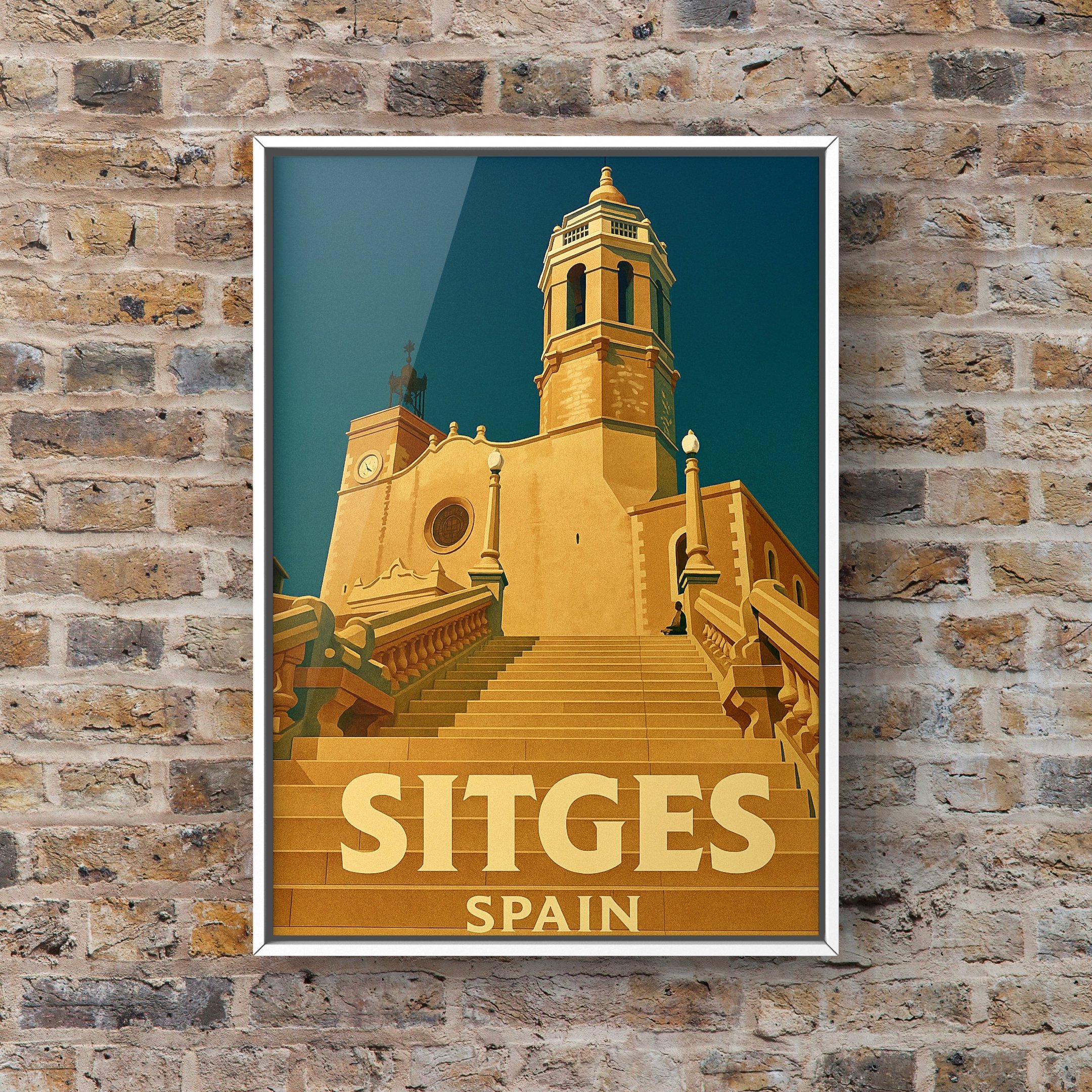 The design draws from the art deco and mid-century modern travel posters I’ve always admired. Strong, classic typography declares “SITGES” and “SPAIN” at the base, a nod to the era when posters were more than advertisements—they were invitations to dream of distant shores.